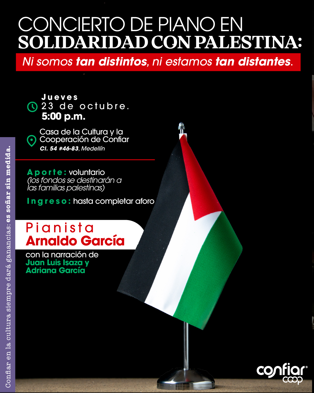Si crees en el valor de la vida, en los derechos humanos y deseas ayudar al pueblo palestino, esta invitación es para ti: súmate a este viaje en las manos magistrales del pianista Arnaldo García, con la narración Juan Luis Isaza y Adriana García, quienes nos acompañarán para demostrar una vez más que la diversidad es la riqueza de la raza humana y que el arte tiene el poder para tejer puentes que la razón no entiende.